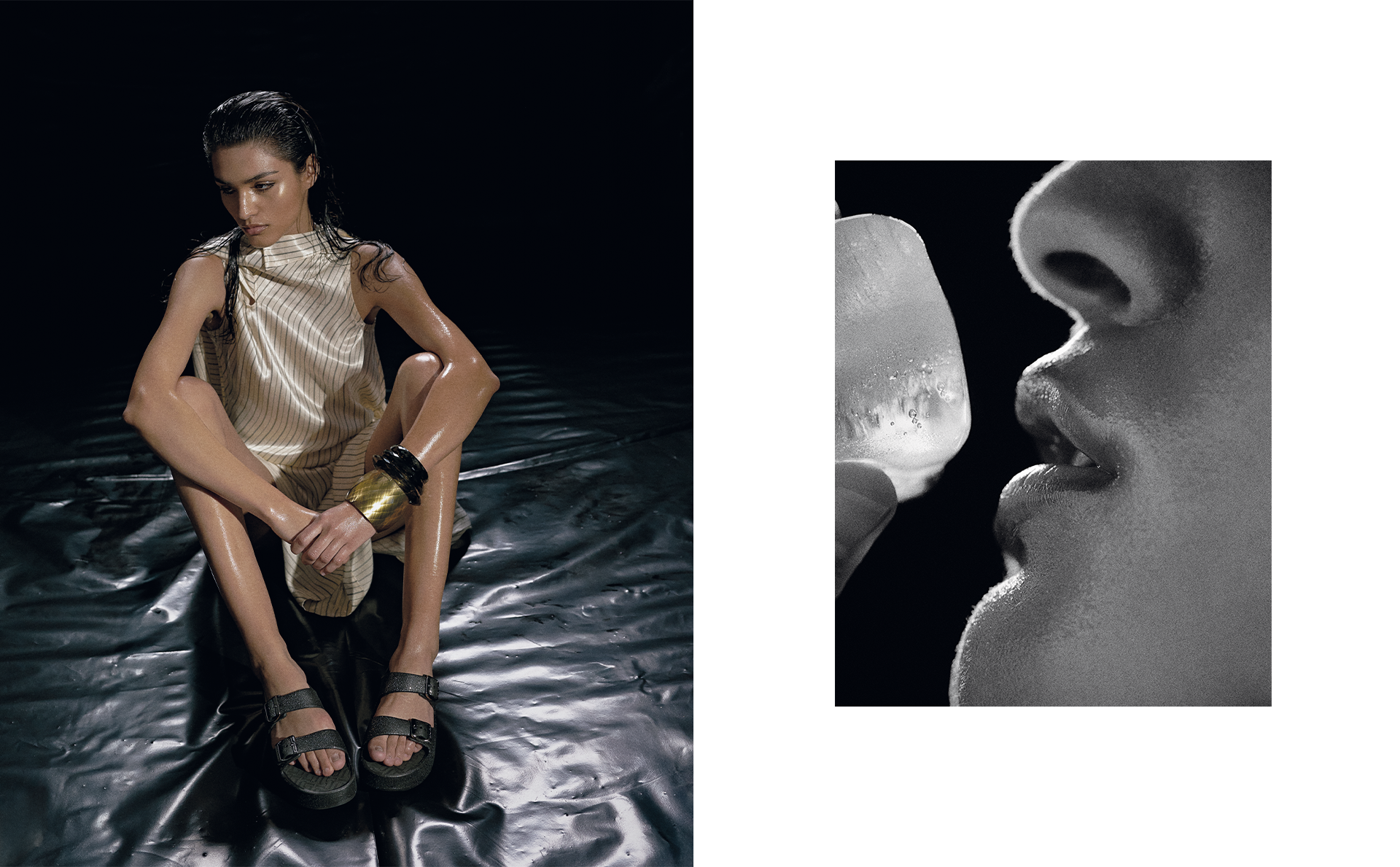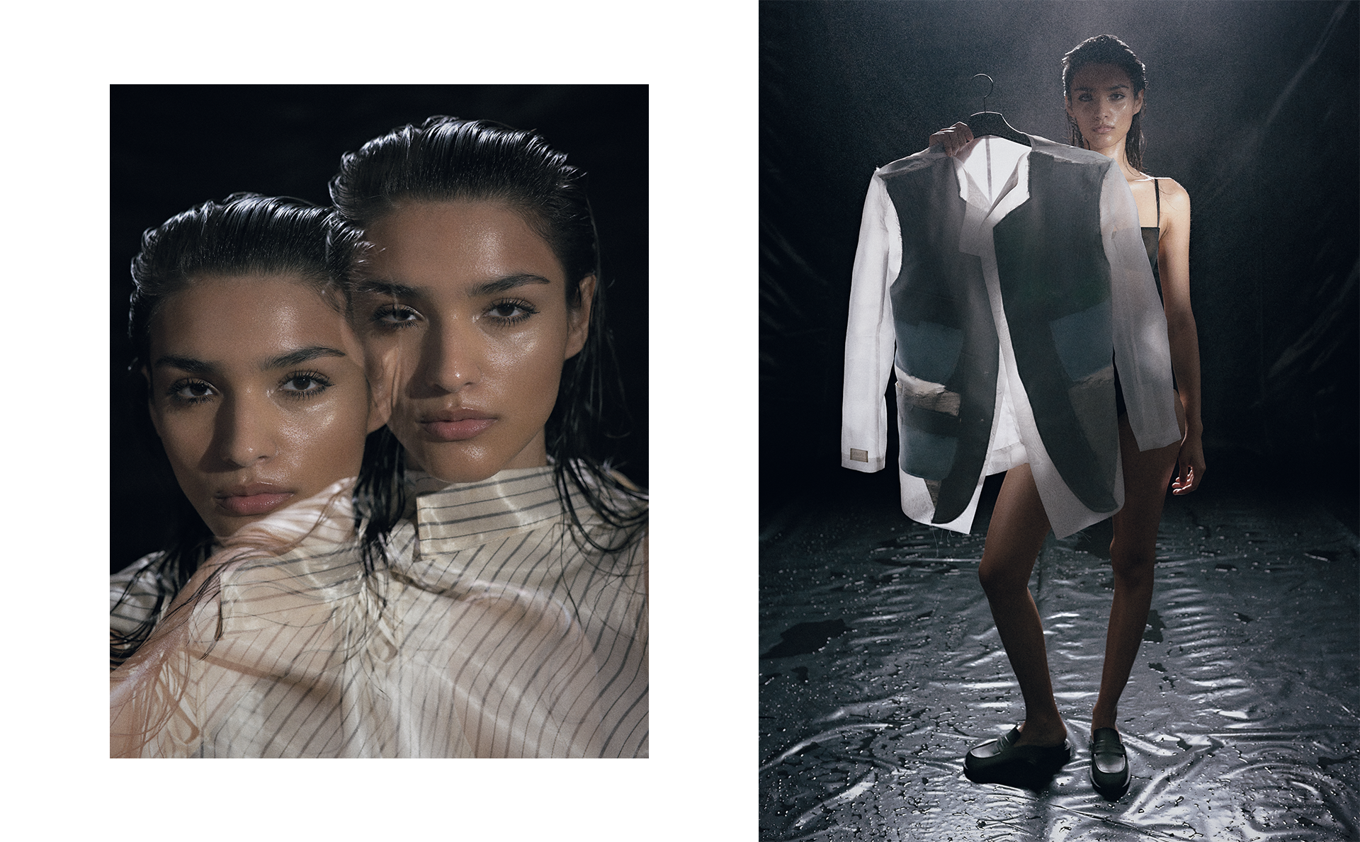 (Left) Dress: Arndes | (Right) Slippers: JJ Heitor; Jacket: Arndes; Underwear: Stylist’s own