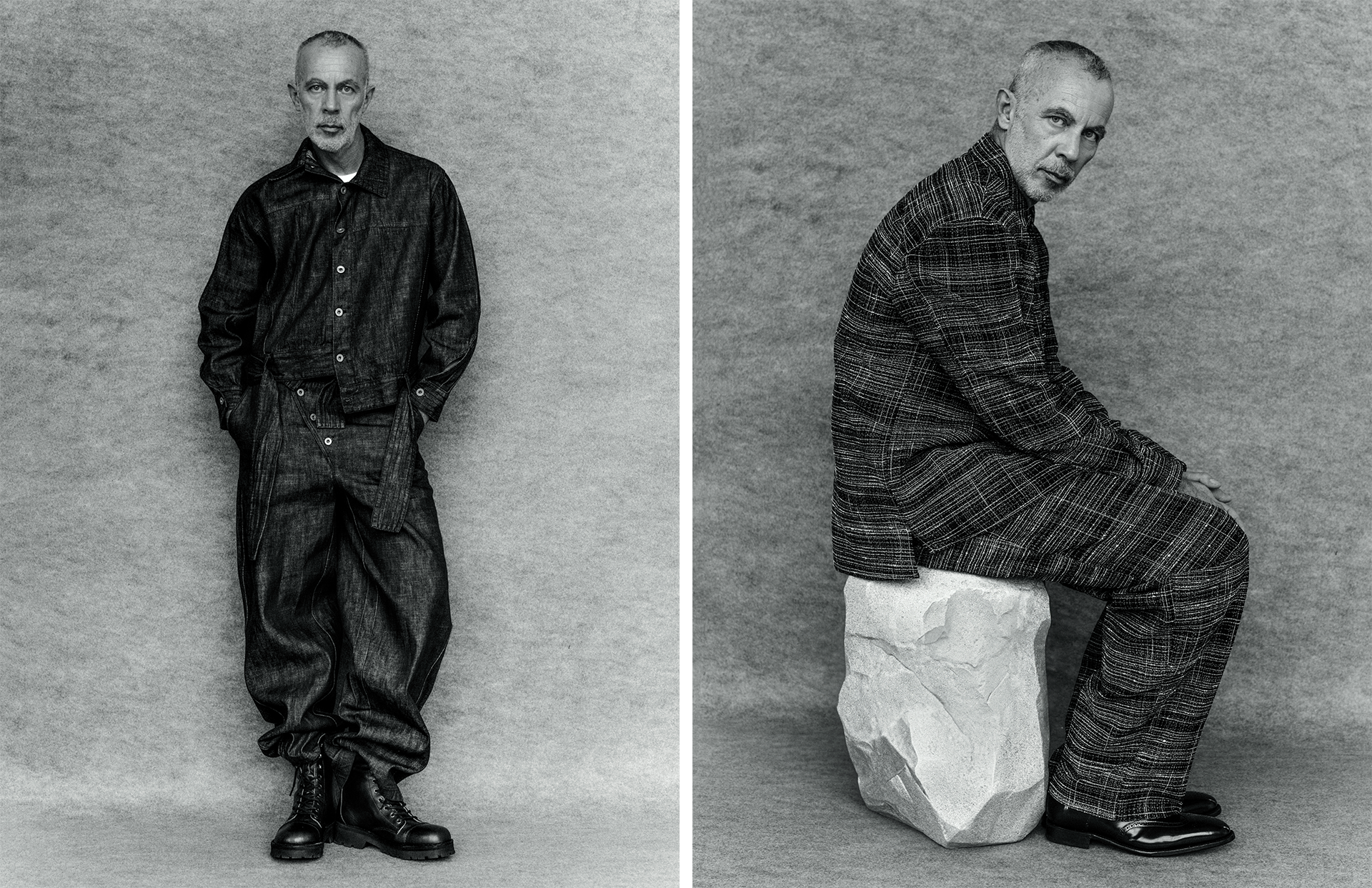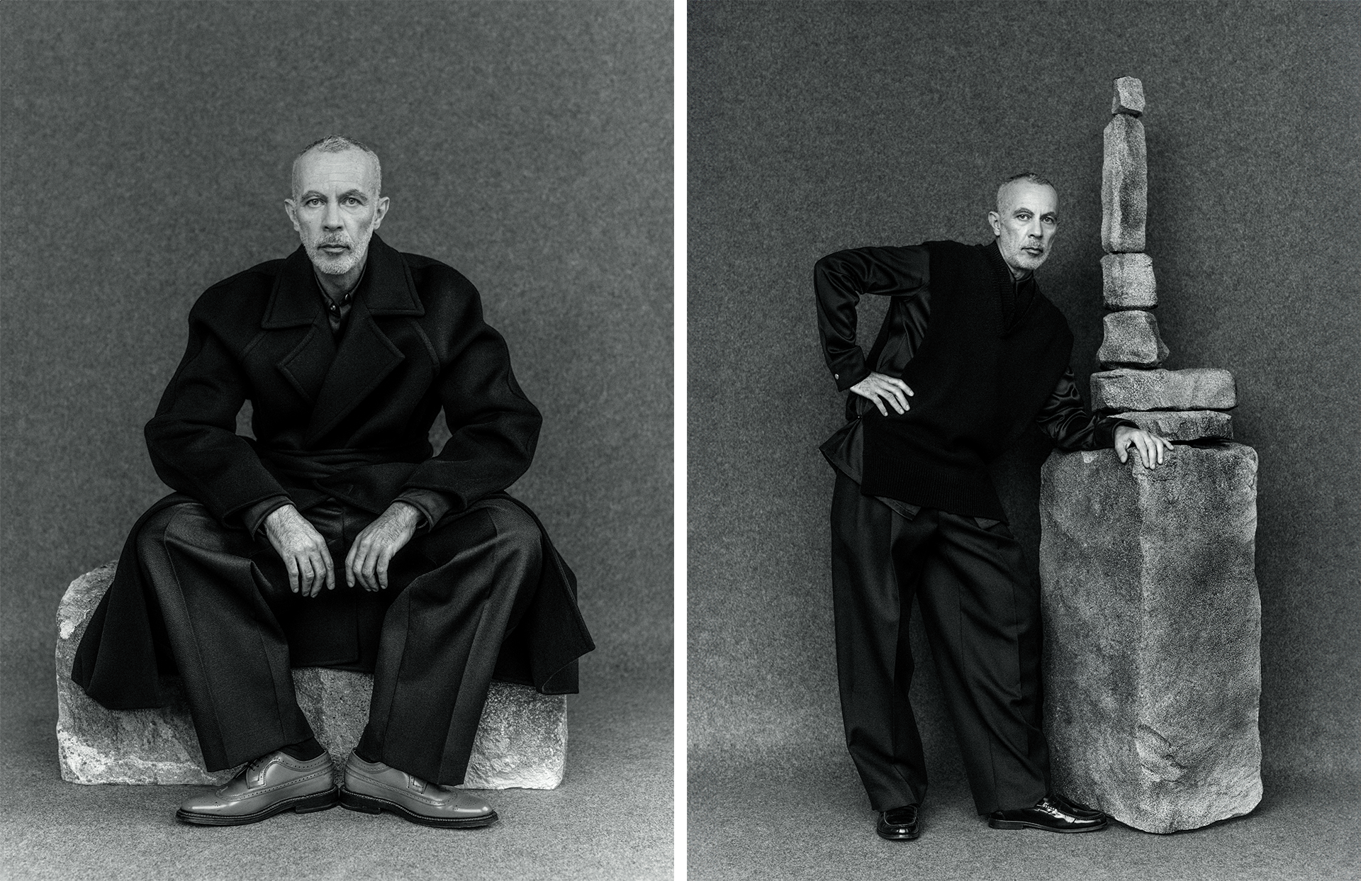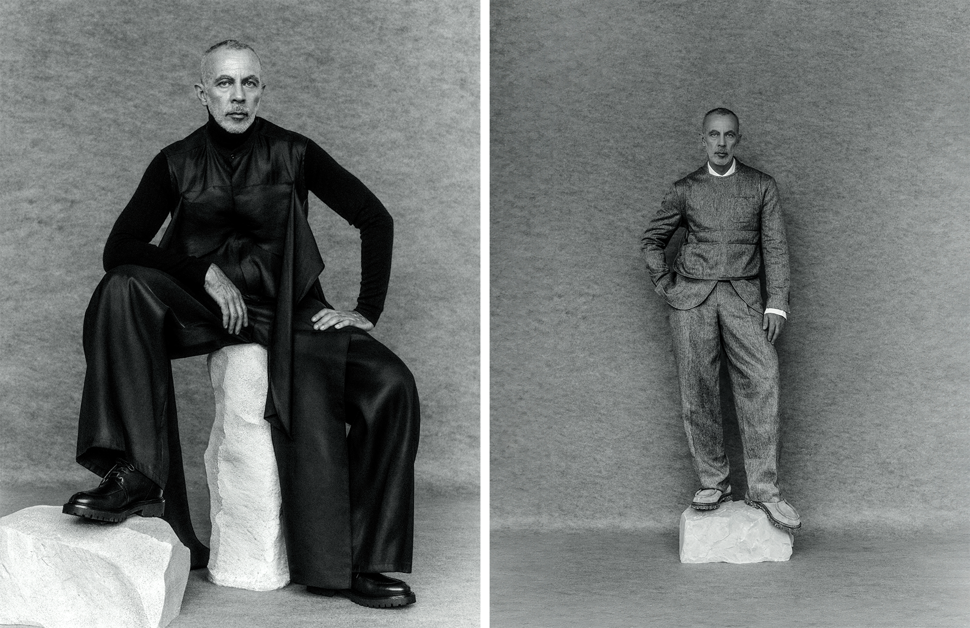 (Left) Shoes: Ambitious; Turtleneck: Stylist own; Vest and trousers: Lidija Kolovrat | (Right) Shoes: Calçado Penha; Total look: David Catalán