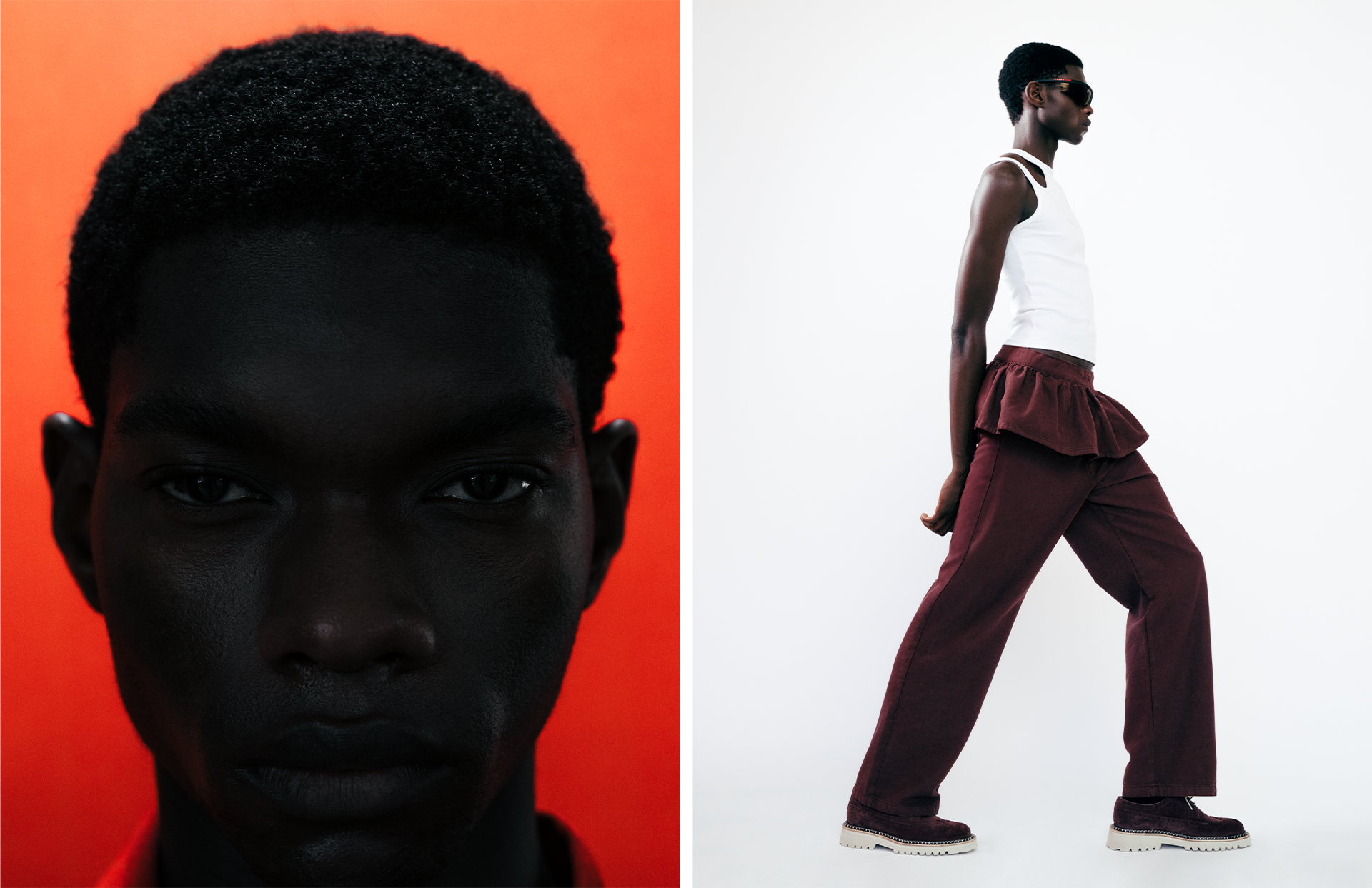 (Left) Shirt: Ernest W. Baker | (Right) Shoes: Valuni; Skirt and trousers: David Catalán; Tank top: Stylist’s own; Sunglasses: Prada