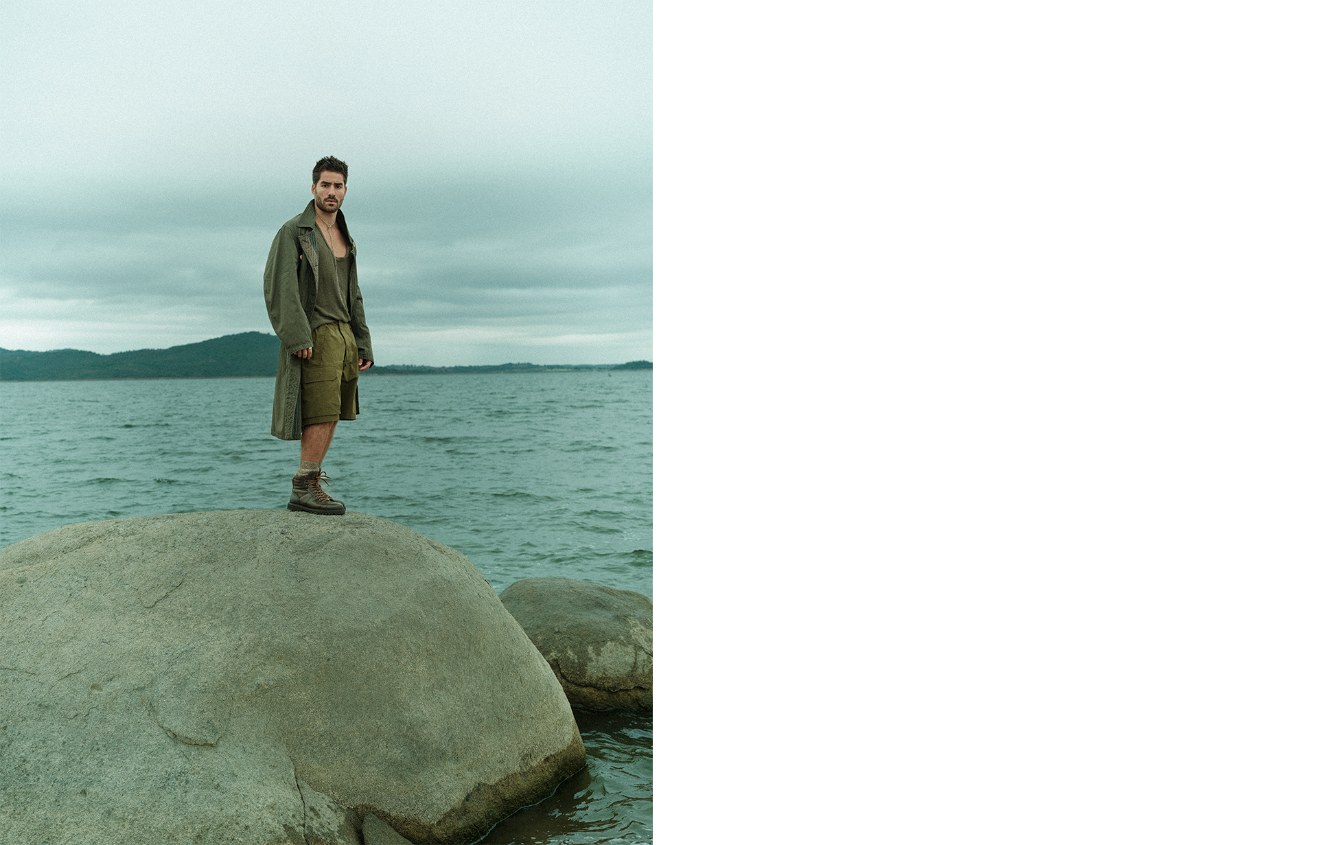 Boots: Ambitious; Trench coat: Kolor; Tanktop: Newspeak; Shorts: Dsquared2; Rings: Talent’s own; Silver chain necklace: Fyr; Socks: Dsquared2