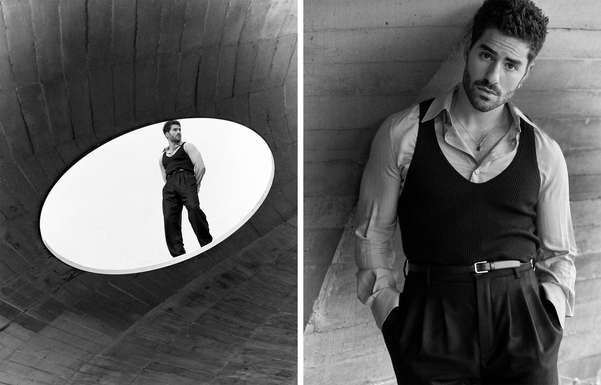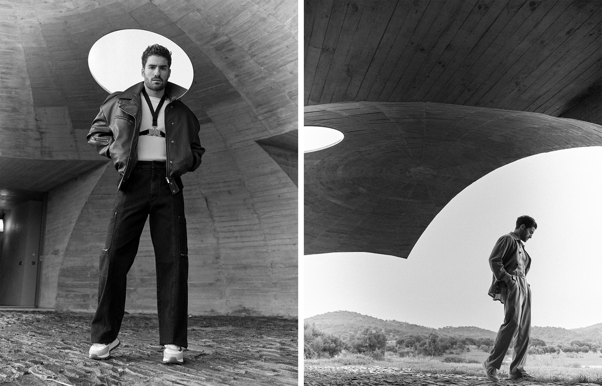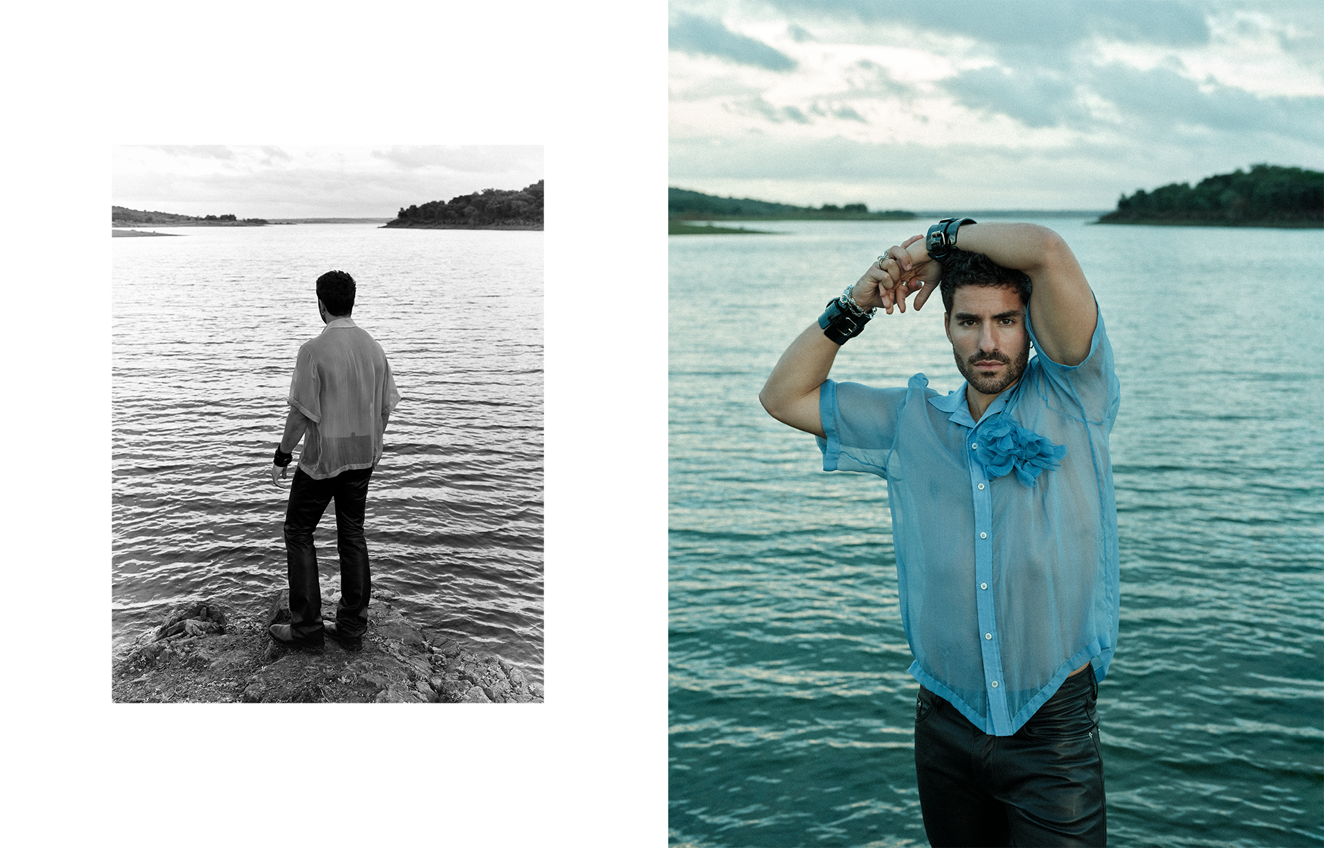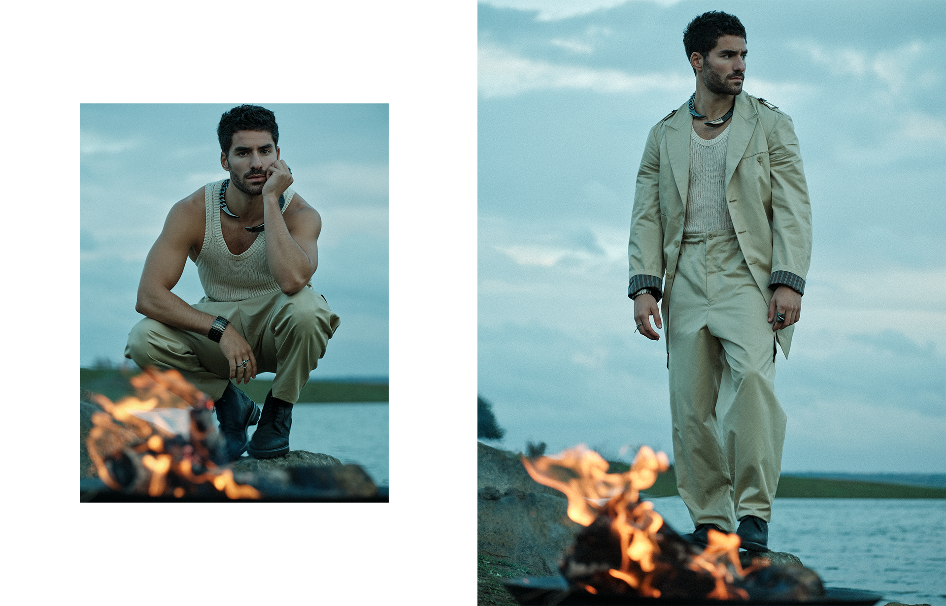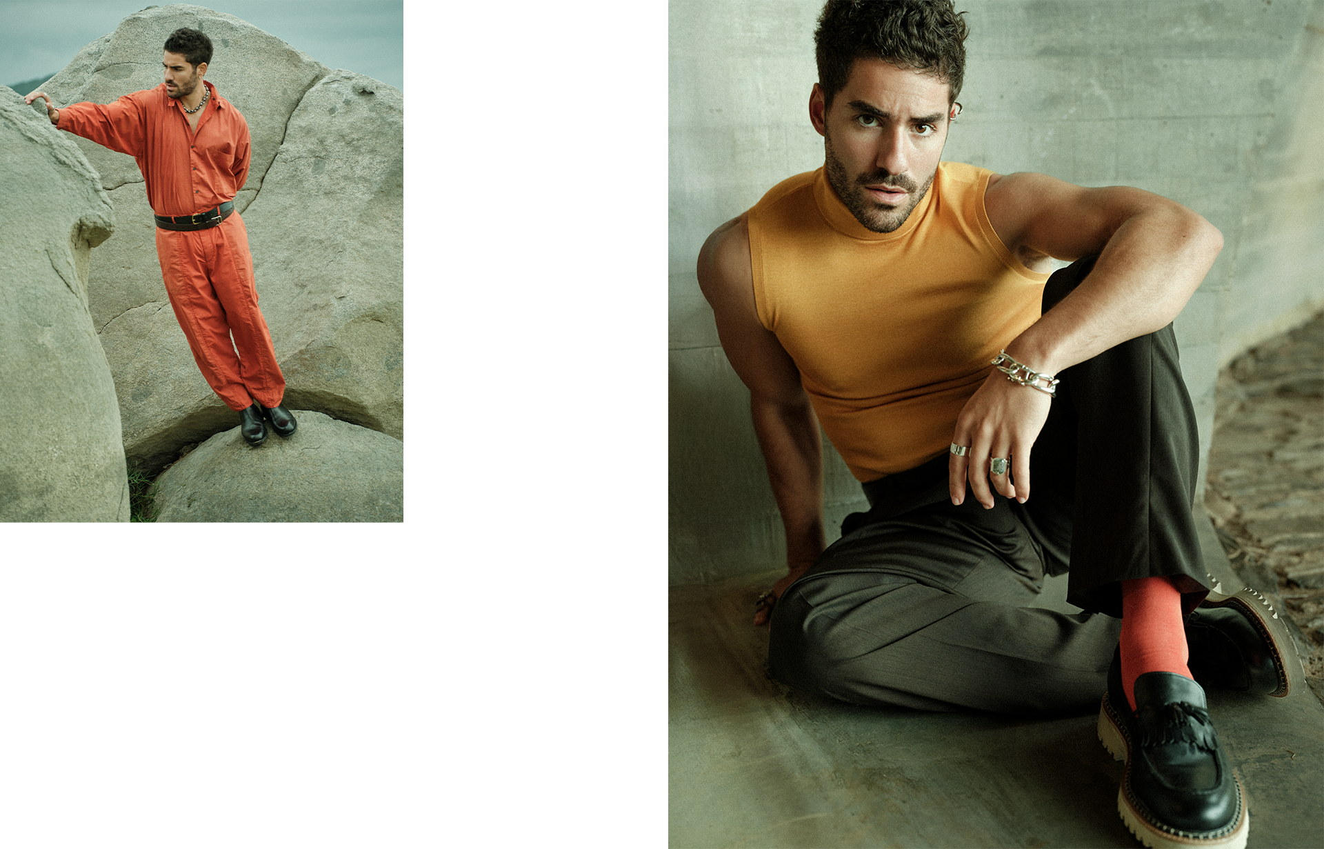 (Left) Chelsea boots: Calçado Penha; Shirt and trousers: Newspeak; Rings: Talent’s own; Chain necklace and stitched leather belt: Hermès; Gold buckle belt: Dsquared2 | (Right) Shoes: Valuni; Top: Loewe; Trousers: Brioni; Ear cuff: Vann; Bracelet: Marc Deloche; Rings: Fyr; Socks: Falke