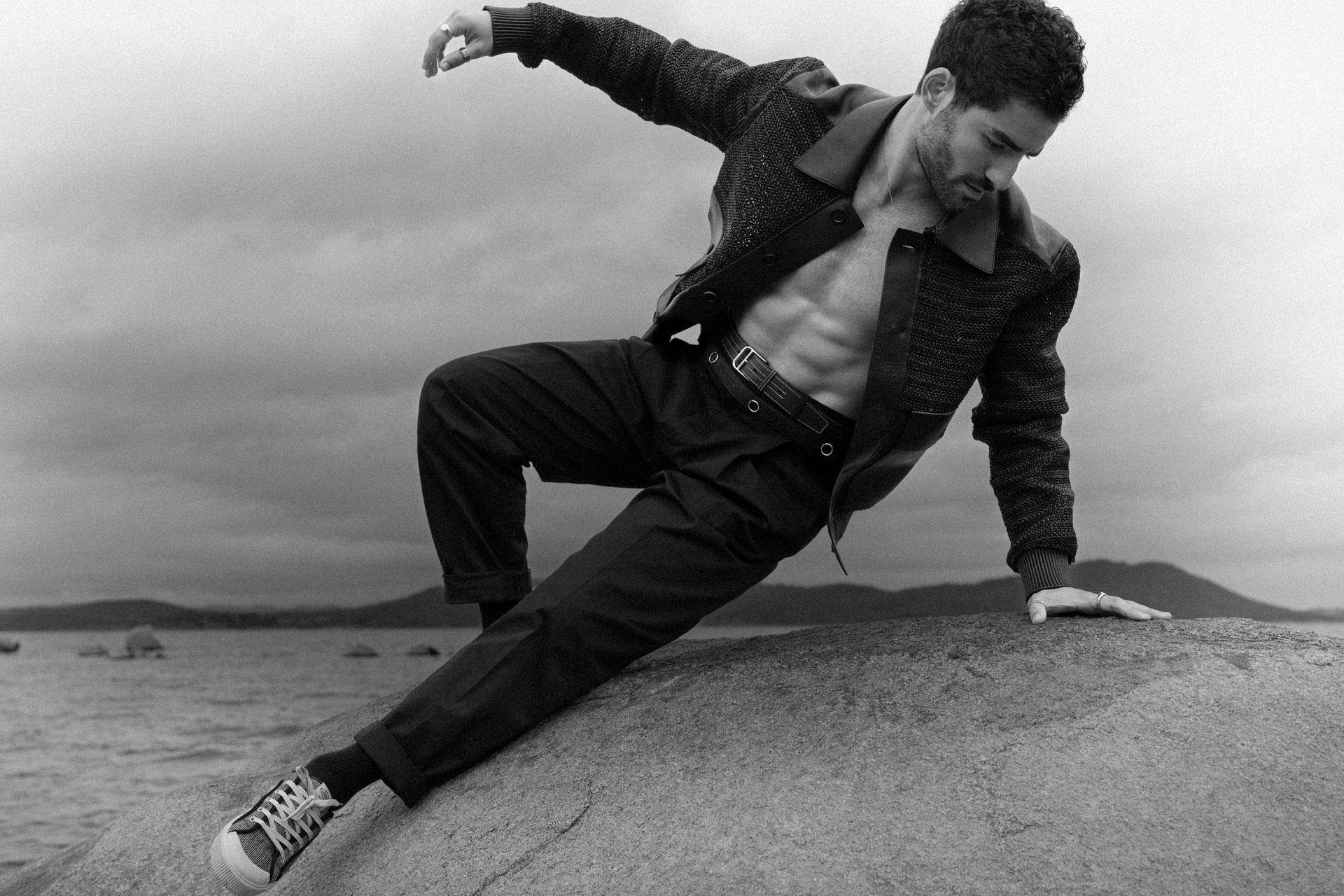 (Left) Sneakers: Tentoes; Biker jacket: System; Tank top, harness and jeans: 1017 Alyx 9SM | (Right) Sneakers: Carlos Santos; Suede shirt and trousers: Brioni; Necklace: Hermès