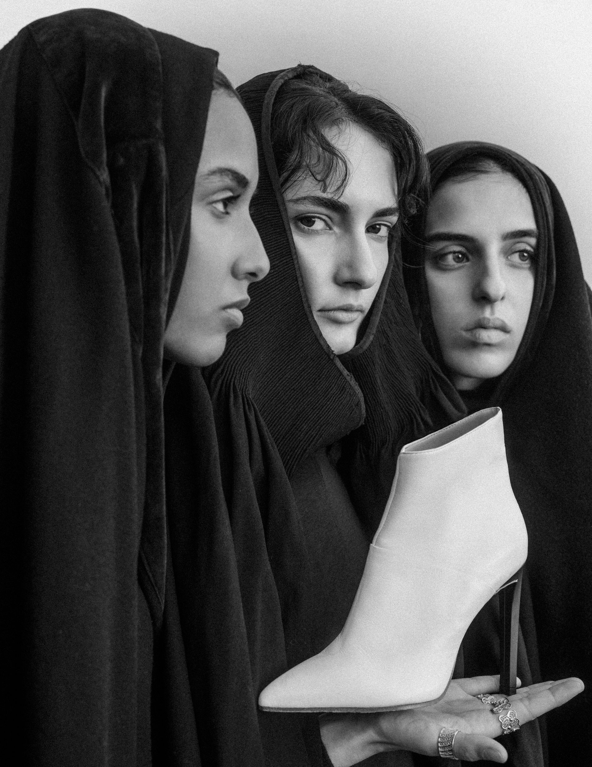 (Left) Knit sweater: Alaia (at Stivali Boutiques) | (Right) FRANCISCA — Shoes: JJ Heitor; Sweater: Alaia; Skirt: Fendi Zâmbia (at Stivali Boutiques); Socks: Calzedonia; Filigree rings: Portugal Jewels | MARIA — Coat: Alaia; Skirt: Comme des Garçon (at Stivali Boutiques); Sweater: Falconeri; Pants: 2B; Scarf: Parfois; Filigree rings: Portugal Jewels | MIRIAM — Shoes: JJ Heitor; Sweater: Falconeri; Skirt and cape: A-Line; Blazer: 2B; Socks: Calzedonia; Filigree heart pendant: Portugal Jewels