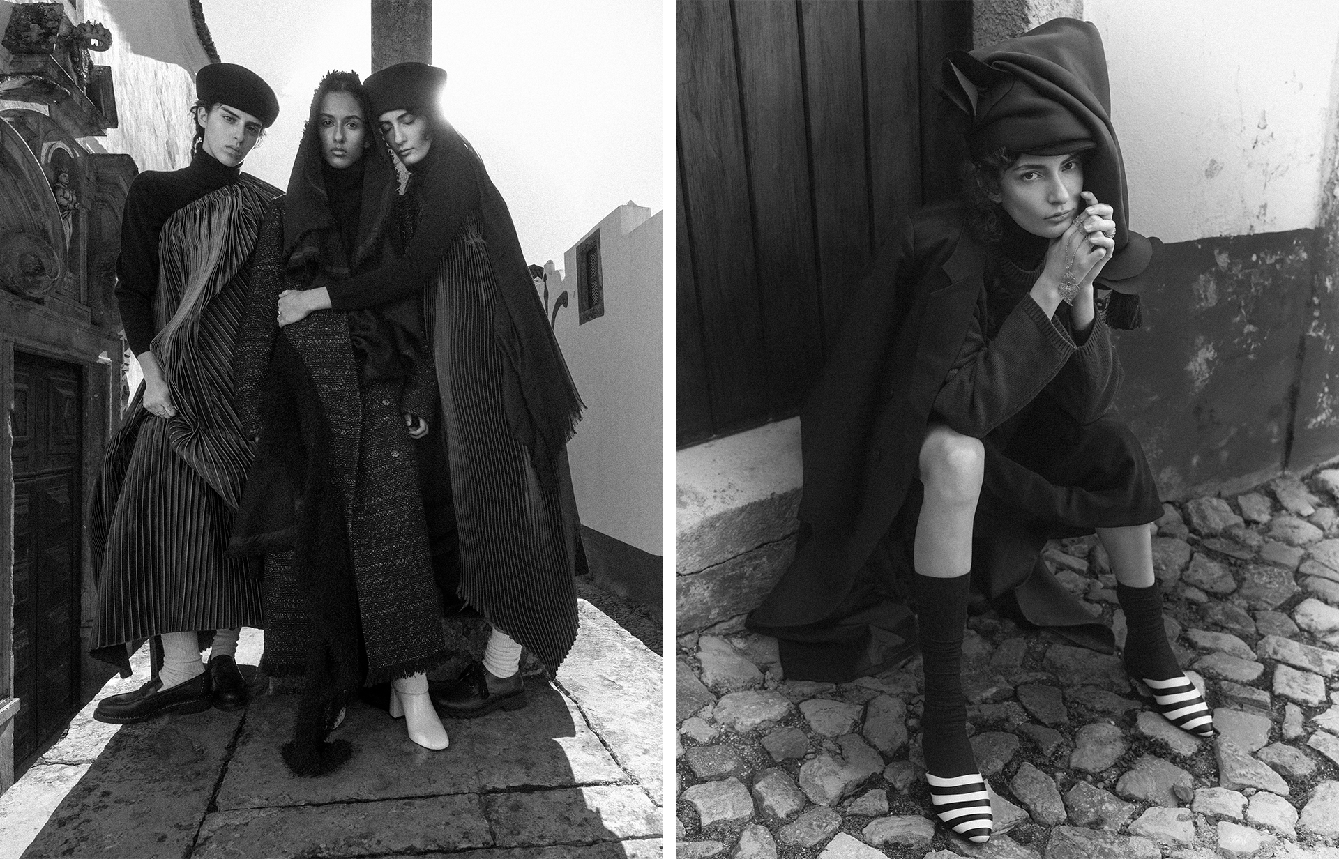 (Left) Shoes: Helena Mar; Leather bags: Marta Ponti; Sweater: Falconeri; Shirt: 2B The Brand; Skirt: Sacai Ana (at Stivali Boutiques); Hat: Parfois; Socks: Calzedonia; Filigree rings: Portugal Jewels | (Right) MARIA — Shoes: Lemon Jelly; Shirt: Noir Kei Ninomiya; Top: Phoebe Philo (at Stivali Boutiques); Swater: Falconeri; Traditional/folk skirt: Production; Filigree rings: Portugal Jewels; Socks: Calzedonia | FRANCISCA — Shoes: Lemon Jelly; Scarf: Parfois; Shirt: Noir Kei Ninomiya; Swater: Falconeri; Traditional/folk skirt: Production; Filigree rings: Portugal Jewels; Socks: Calzedonia | MIRIAM — Shoes: Lemon Jelly; Shirt: Valentino; Top: Wardrobe (at Stivali Boutiques); Traditional/folk skirt: Production; Filigree rings: Portugal Jewels; Socks: Calzedonia