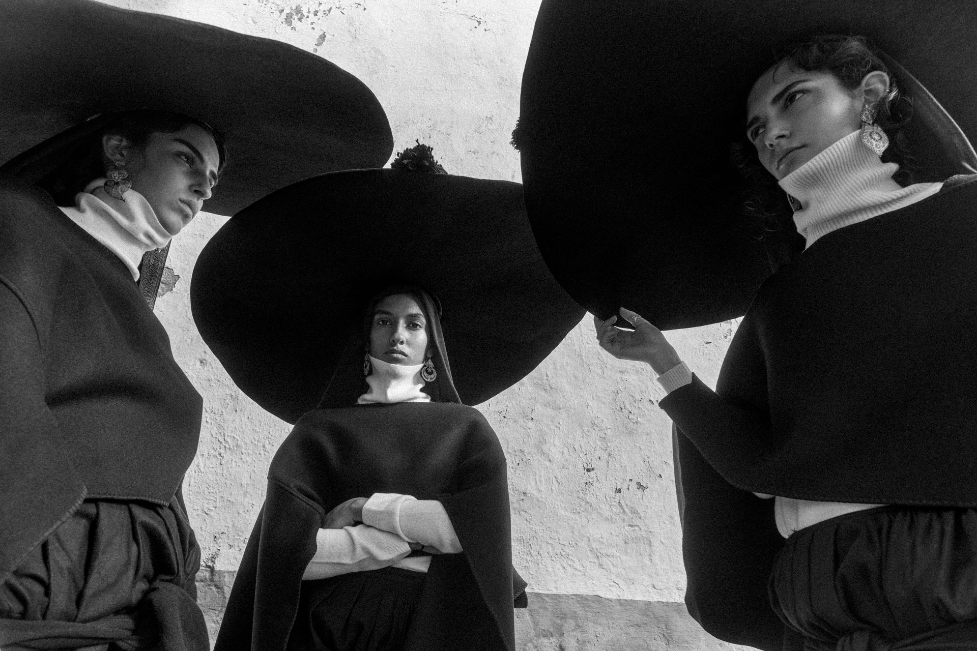 Cashmere turtleneck: Falconeri; Wool cape: A-Line; Scarf: Parfois; Earrings and rings: Portugal Jewels; Traditional/folk hats: Production.
