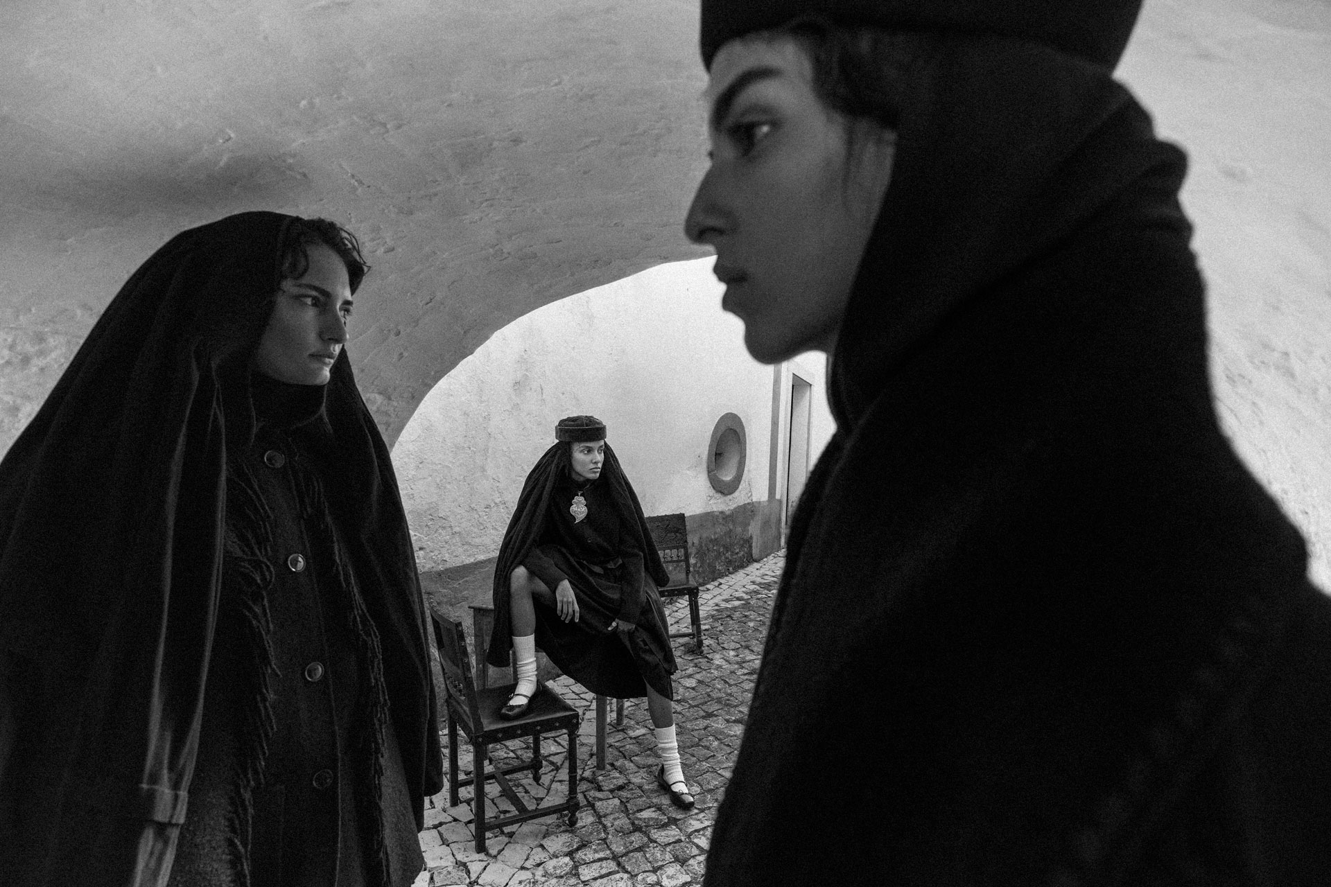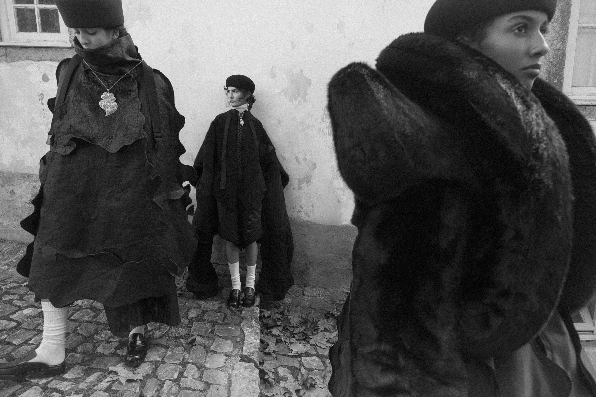 MIRIAM — Ballet flats: Helena Mar; Cardigan with shirt: Sacai (at Stivali Boutiques); Skirt: Comme des Garçon (at Stivali Boutiques); Traditional/folk skirt worn on the head and traditional/folk hat: Production; Socks: Calzedonia; Filigree heart pendant: Portugal Jewels | FRANCISCA — Scarf and hat: Parfois; Coat: Toteme; Sweater: Allude (at Stivali Boutiques) | MARIA — Coat: Toteme (at Stivali Boutiques); Sweater: Falconeri