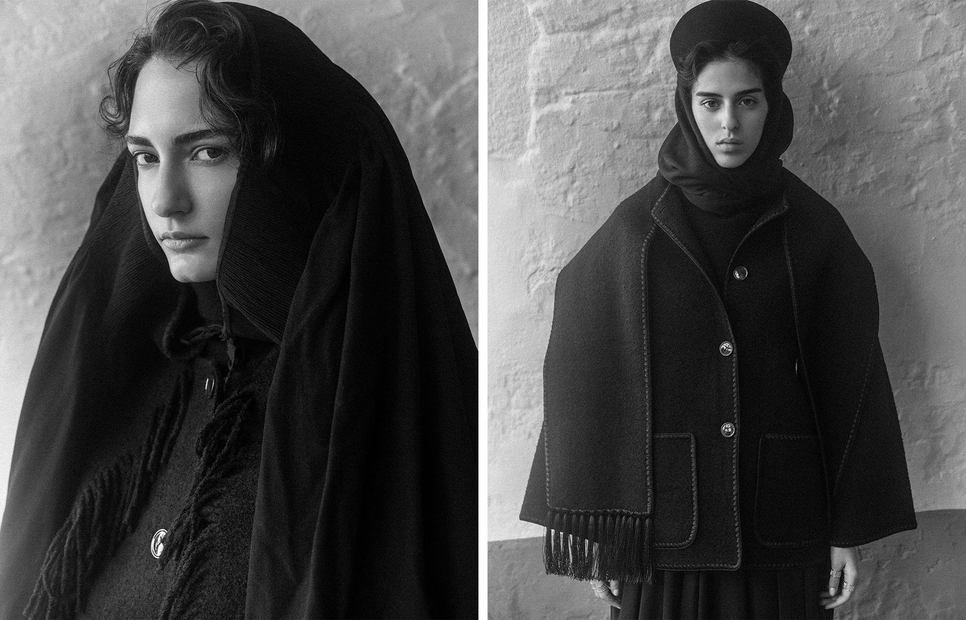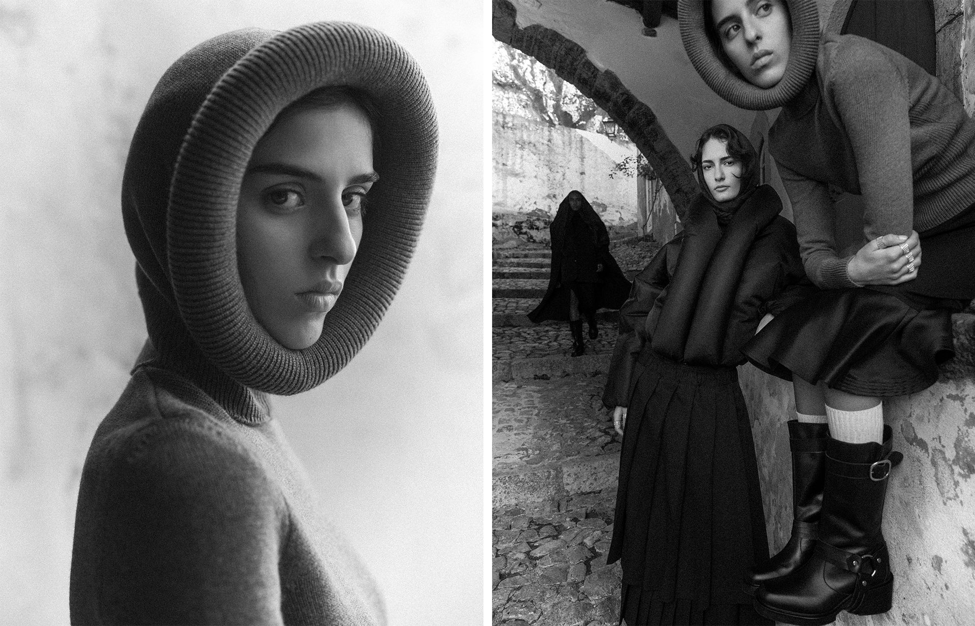 (Left) MARIA — Shoes: Fly London; Wool coat: Toteme; Skirt: Lemaire (both at Stivali Boutiques); Cashmere turtleneck: Falconeri | (Right) MIRIAM — Cardigan with shirt: Sacai (at Stivali Boutiques); Sweater: Falconeri; Skirt: Comme des Garçon (at Stivali Boutiques); Traditional/folk skirt worn on the head and traditional hat: Production; Filigree heart pendant and rings: Portugal Jewels