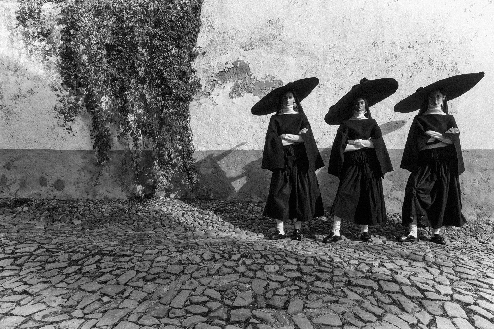 MIRIAM — Ballet flats: Helena Mar; Cardigan with shirt: Sacai (at Stivali Boutiques); Skirt: Comme des Garçon (at Stivali Boutiques); Traditional/folk skirt worn on the head and traditional hat: Production; Socks: Calzedonia; Filigree heart pendant: Portugal Jewels | MARIA — Shoes: Fly London; Coat: Toteme (at Stivali Boutiques); Skirt: Lemaire (at Stivali Boutiques); Jewellery: Portugal Jewels | FRANCISCA — Shoes: Valuni; Scarf and hat: Parfois; Coat: Toteme; Sweater: Allude; Silk skirt: Lemaire; Skirt: Fendi (all at Stivali Boutiques); Socks: Calzedonia; Filigree rings: Portugal Jewels