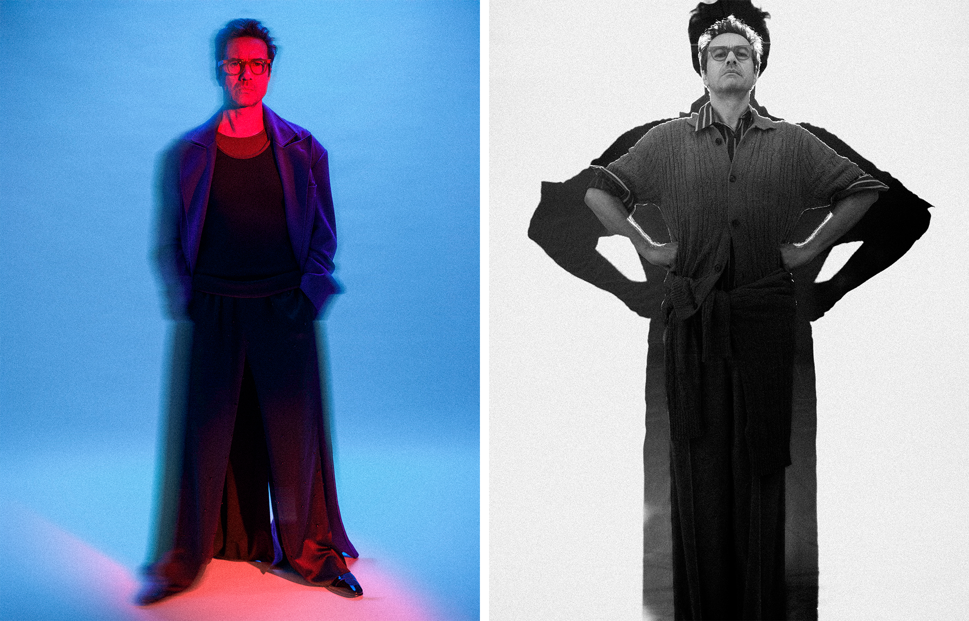 (Left) Shoes: Mariano; Coat: Luís Carvalho; Tank Tops: Novos Malandros; Trousers: Miguel Vieira | (Right) Shoes: Centenário; Polo, cardigan and trousers: OAS; Shirt: Humana Vintage