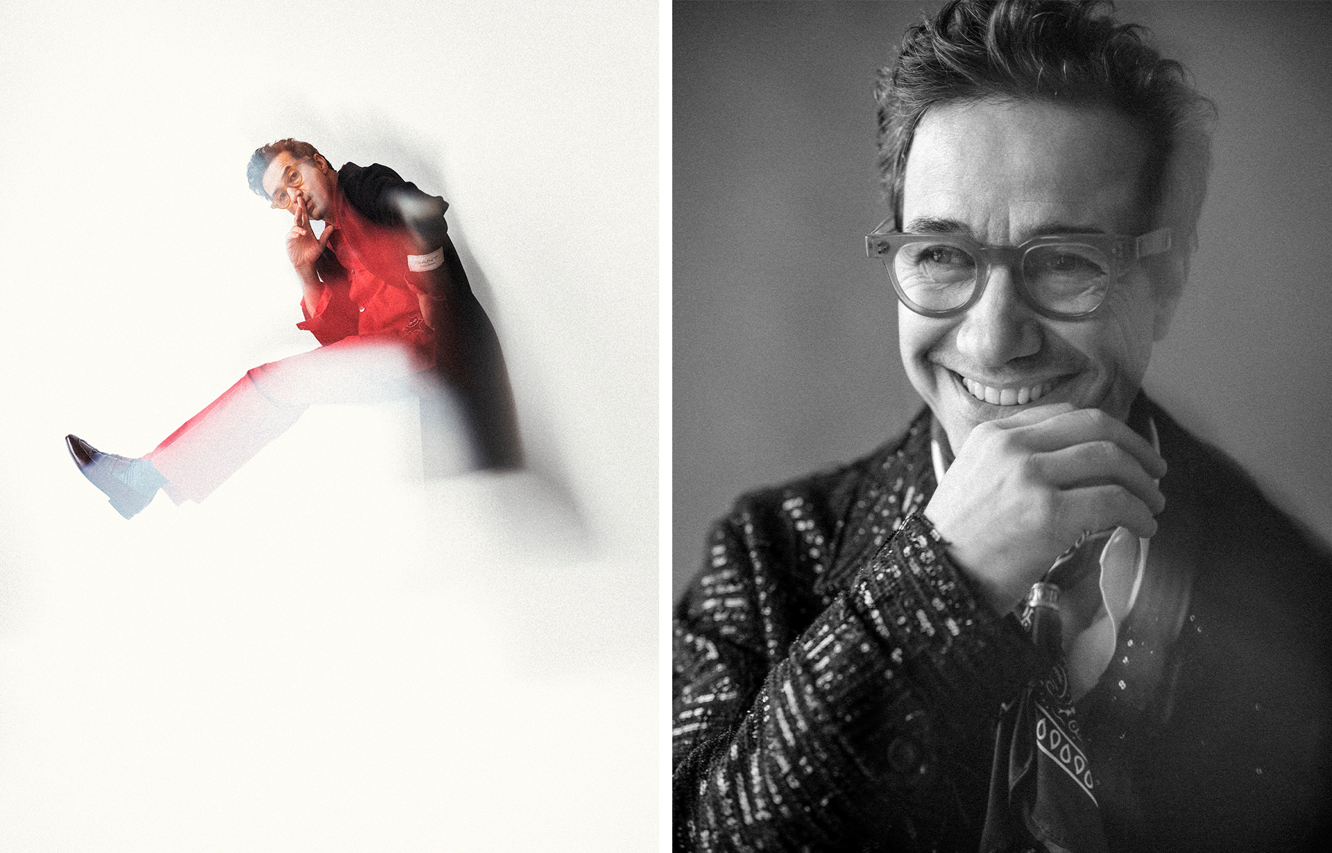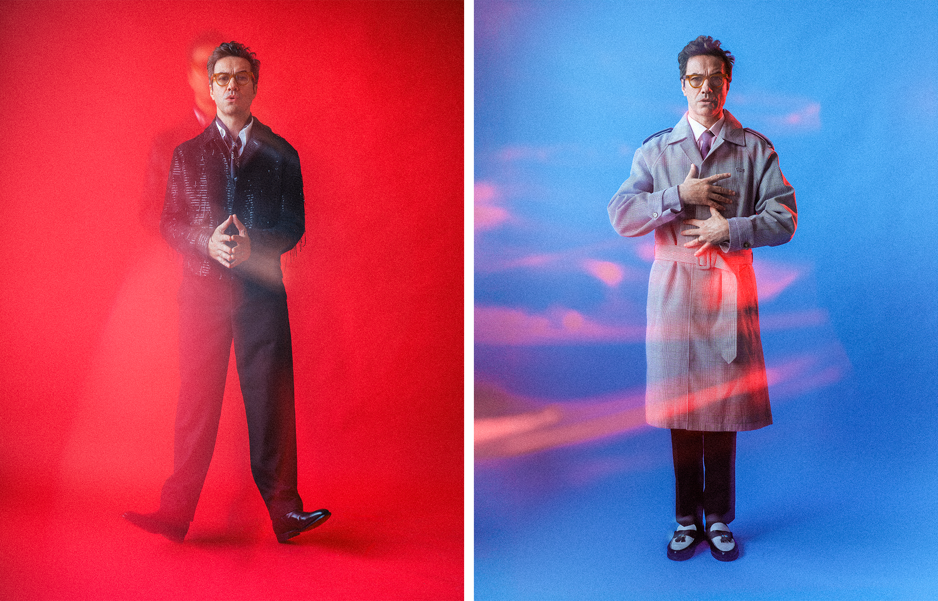 (Left) Shoes: Carlos Santos; Jacket: Miguel Vieira; Shirt: Givenchy; Scarf and Ring: Stylist’s own; Trousers: Gant | (Right) Shoes: Miguel Vieira; Coat: Lacoste; Shirt: Dustin; Tie: Hugo Boss; Trousers. Tagliatore