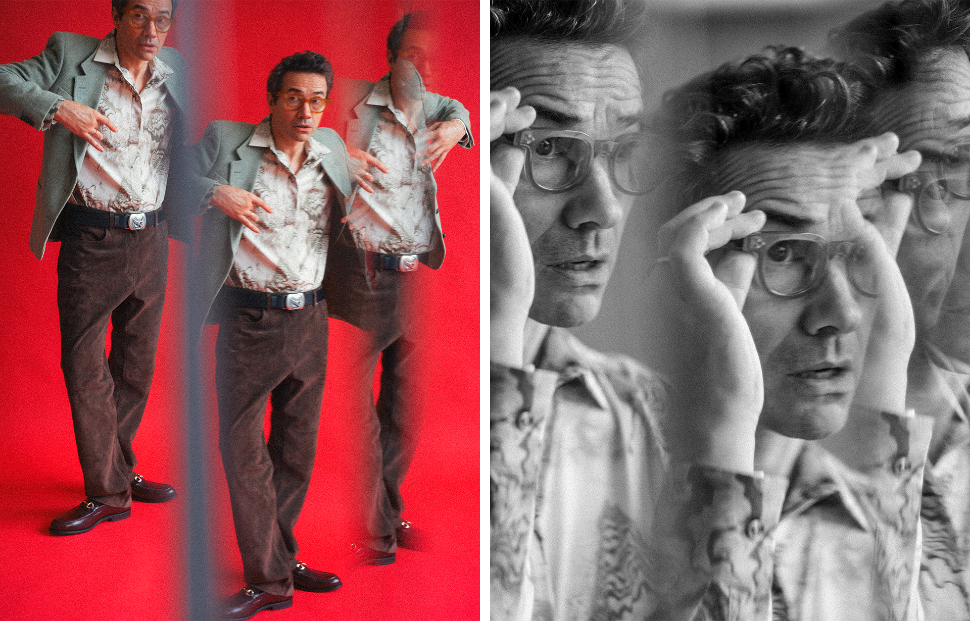(Left) Shoes: Penha; Blazer: Humana Vintage; Shirt: Novos Malandros; Belt: Fuzzy Eye; Trousers: Gant | (Right) Shirt: Novos Malandros