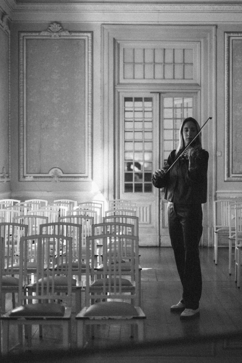 From all of these influences she recorded her own album that came out in 2022, entitled Caminhos. The group she formed to create this album had a completely different setup from what it was common as they had to perform repertoire with roots from portuguese traditional music, baroque, tango, jazz and morna, turning the violin into a world music relic in the center of the stage. Doing this almost blindly – as she refers the lack of management knowledge as a tremendous gap in music education – and putting away the fear of being put in a box distant from the classical world she grew and worked in, she kept showing these pieces to friends who saw the value in what she was doing, even though it was something new, and encouraged her.